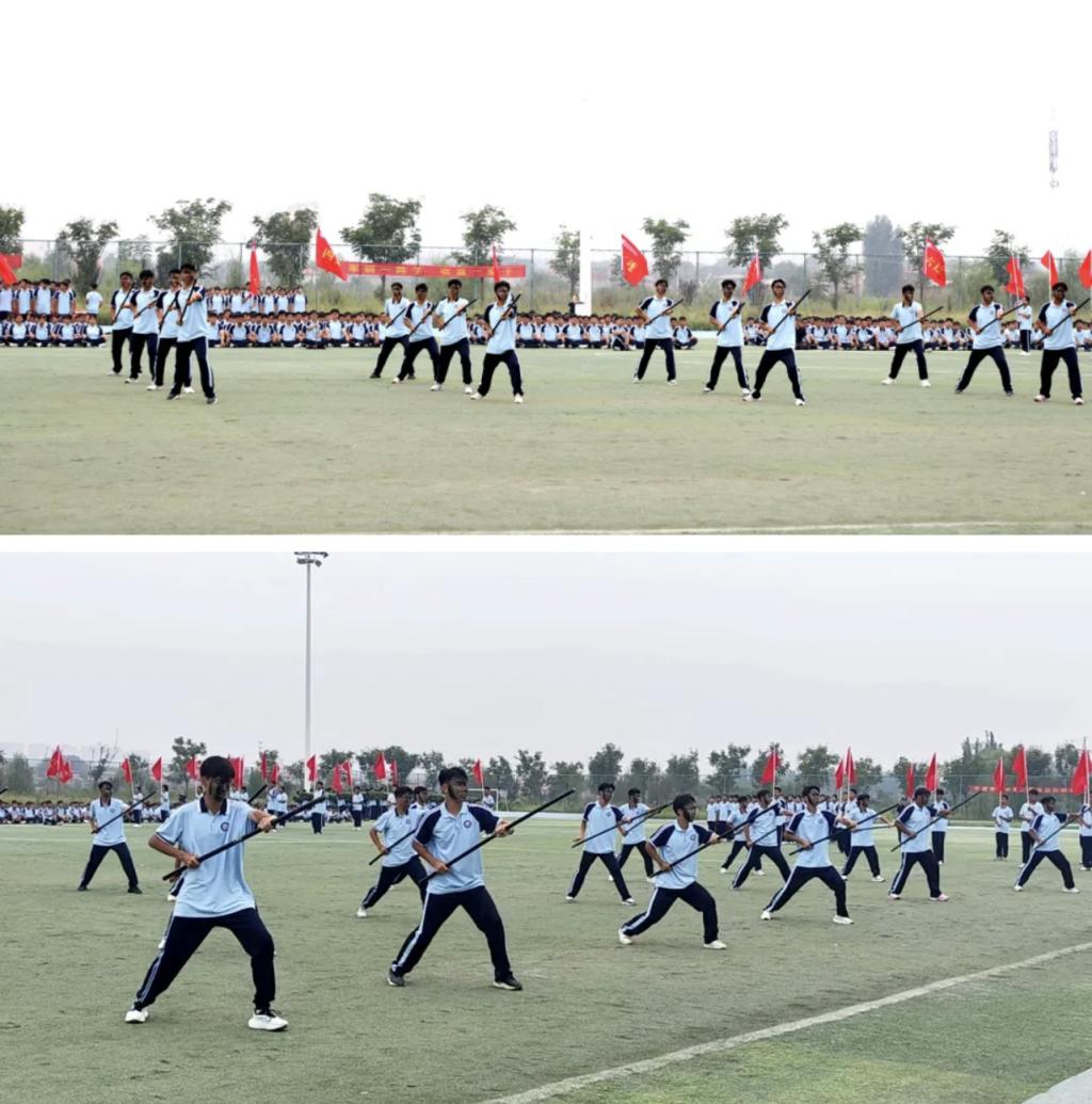 刀旗手、拳术表演、九节鞭、单刀表演、双人剑、少林连环拳,一场场武术表演次第登场,将力与美的交融演绎得淋漓尽致。精准的招式、铿锵的发力,既是训练成果的生动印证,更是 “请党放心、强国有我” 的青春誓言,在晨光与剑光交织中,掷地有声。