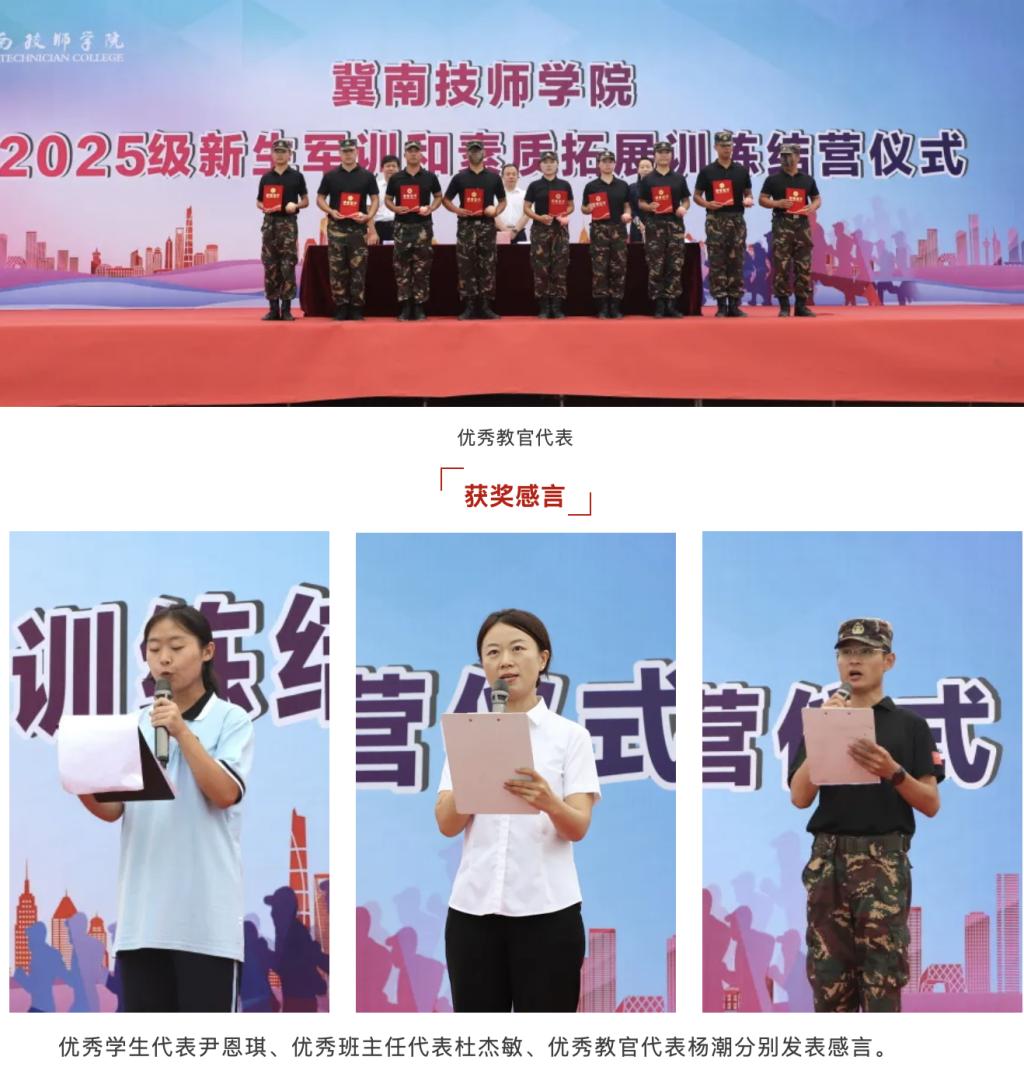 青春逐梦正当时,不负韶华砺锋芒。9月5日,冀南技师学院2025级新生军训和素质拓展训练结营仪式在职教城体育场隆重举行。学院党委书记许克亮、院长田青、副院长王振峰出席结营仪式,全体班主任、教官共同见证新生们用汗水与坚持书写的成长答卷。结营仪式由学院副院长王振峰主持。