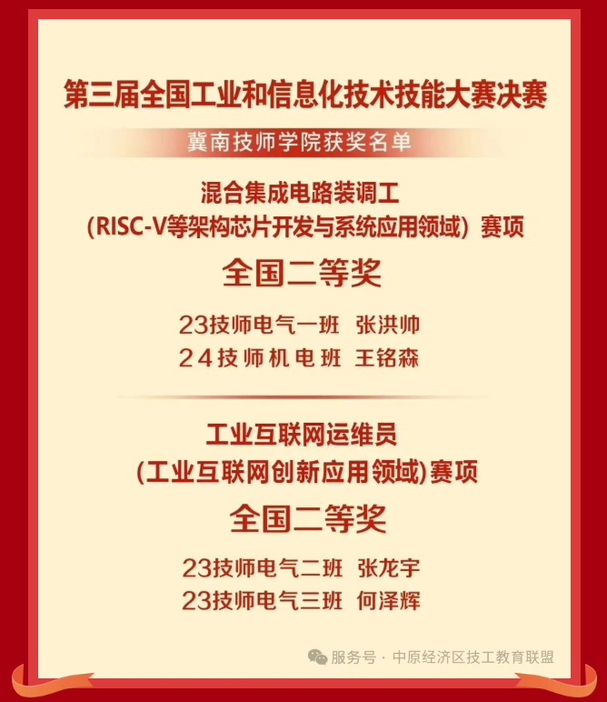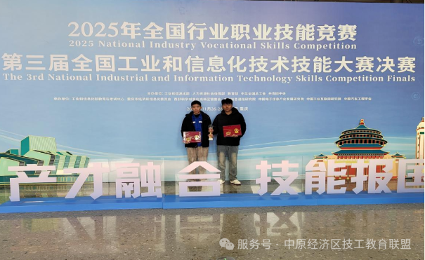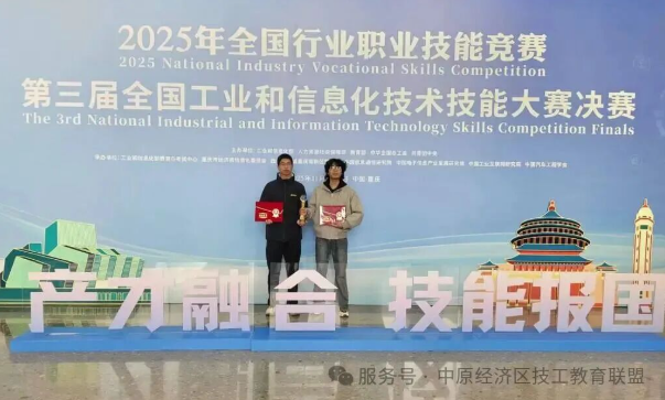 近日,由工业和信息化部、人力资源和社会保障部、教育部、中华全国总工会和共青团中央共同主办的第三届全国工业和信息化技术技能大赛(全国一类职业技能大赛)在重庆圆满落下帷幕。本届大赛聚焦智能网联新能源汽车、智能工业机器人、RISC-V等架构芯片开发与系统应用、工业大数据、制造业数字化转型、工业互联网创新应用等前沿技术领域,吸引了全国800余名技能精英同台竞技。经过激烈角逐,我院参赛选手凭借扎实的专业技能和出色的现场发挥,最终斩获两项二等奖,展现了我院高素质技能人才培养的优异成果。