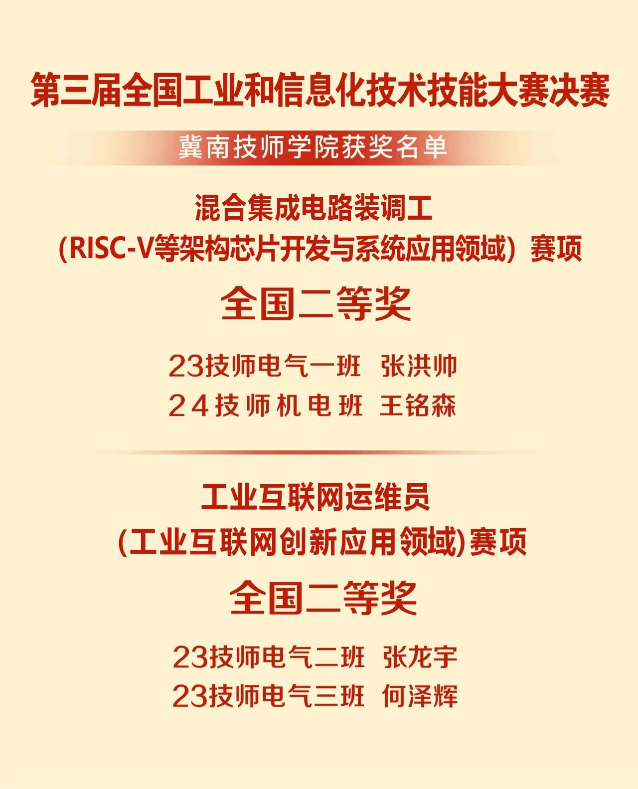 近日,由工业和信息化部、人力资源和社会保障部、教育部、中华全国总工会和共青团中央共同主办的第三届全国工业和信息化技术技能大赛(全国一类职业技能大赛)在重庆圆满落下帷幕。本届大赛聚焦智能网联新能源汽车、智能工业机器人、RISC-V等架构芯片开发与系统应用、工业大数据、制造业数字化转型、工业互联网创新应用等前沿技术领域,吸引了全国800余名技能精英同台竞技。经过激烈角逐,我院参赛选手凭借扎实的专业技能和出色...